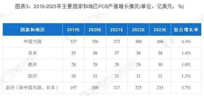 據(jù)Prismark預(yù)測,未來5年亞洲將繼續(xù)主導(dǎo)全球PCB市場的發(fā)展,而中國的核心地位更加穩(wěn)固,中國大陸地區(qū)PCB行業(yè)將保持4.4%的復(fù)合增長率,至2023年行業(yè)總產(chǎn)值將達(dá)到405.56億美元。在PCB公司"大型化、集中化"趨勢下,已較早確立領(lǐng)先優(yōu)勢的大型PCB公司將在未來全球市場競爭中取得較大優(yōu)勢。