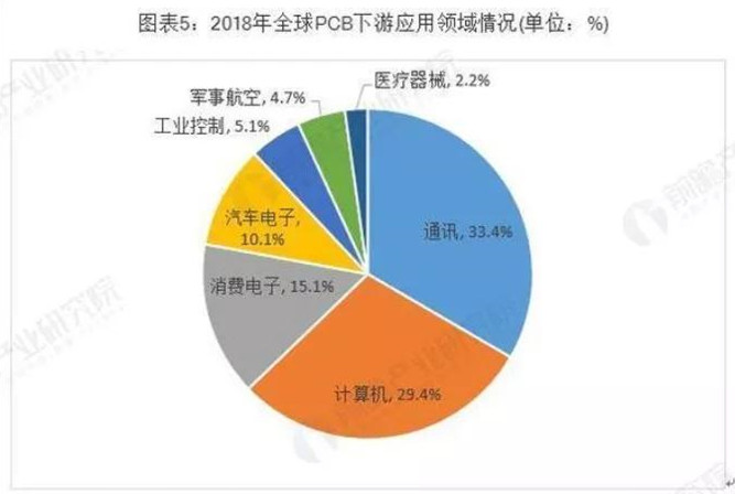 電子信息產(chǎn)業(yè)的蓬勃發(fā)展是PCB行業(yè)發(fā)展的重要助力。從下游應(yīng)用領(lǐng)域分布來看,2018年通訊行業(yè)的PCB市場規(guī)模最大,占比約為33.4%;其次是計算機(jī)行業(yè),占比約為29.4%。其他領(lǐng)域PCB市場規(guī)模較大的是消費(fèi)電子、汽車電子。