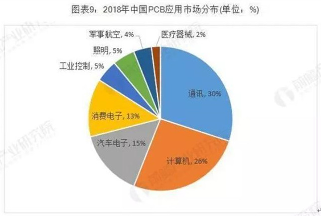全球PCB下游應(yīng)用市場分布廣泛,主要包括通訊、計算機(jī)、消費(fèi)電子、汽車電子、工業(yè)控制、軍事航空、醫(yī)療器械等領(lǐng)域。根據(jù)Prismark的統(tǒng)計,2018年全球PCB下游應(yīng)用領(lǐng)域分布如下: